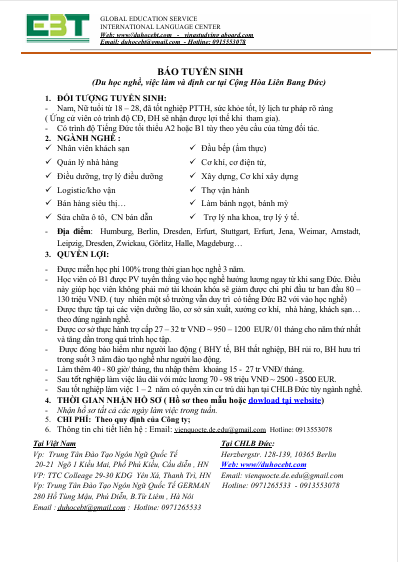 Kính gửi Quý phụ huynh và học sinh, sinh viên có nguyện vọng học tập và làm việc tại nước ngoài, Căn cứ vào nhu cầu nhân lực tại Cộng hòa Liên bang Đức và các chương trình hợp tác đào tạo quốc tế hiện nay, CÔNG TY TNHH QUỐC TẾ EBT trân trọng thông báo tuyển sinh chương trình Du học nghề kết hợp cơ hội làm việc và định cư tại CHLB Đức, với thông tin cụ thể như sau: